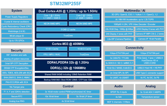 1.5 GHz Dual ARM® Cortex®-A35 based STM32MP255 |